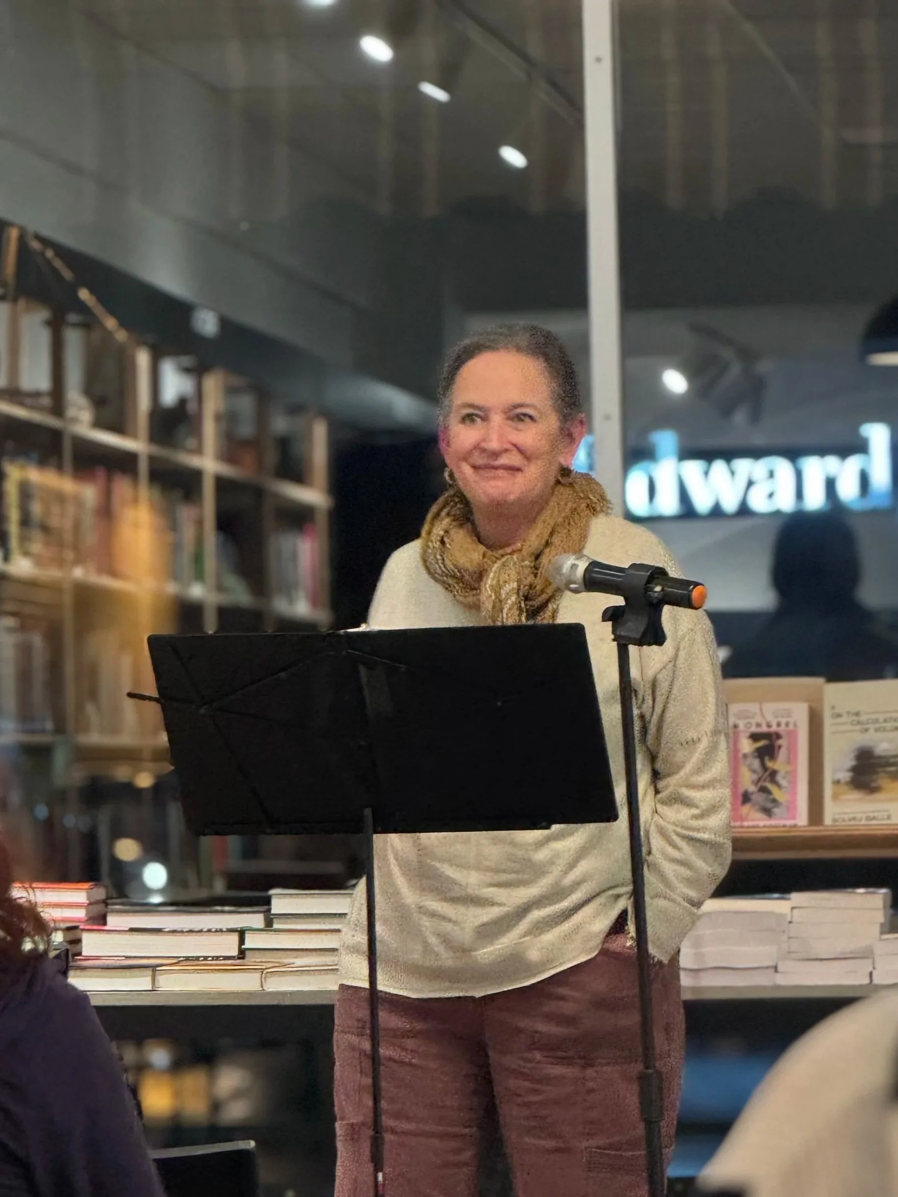 Helen Schulman is the New York Times bestselling author of seven novels, including Come with Me and This Beautiful Life. Schulman has received fellowships from the Guggenheim Foundation, the New York Foundation for the Arts, Sundance, Aspen Words, and Columbia University. She lives in New York City. (PHOTO: We listened from off stage as Jolene Moffatt charmed the crowd with her storytelling prowess.)