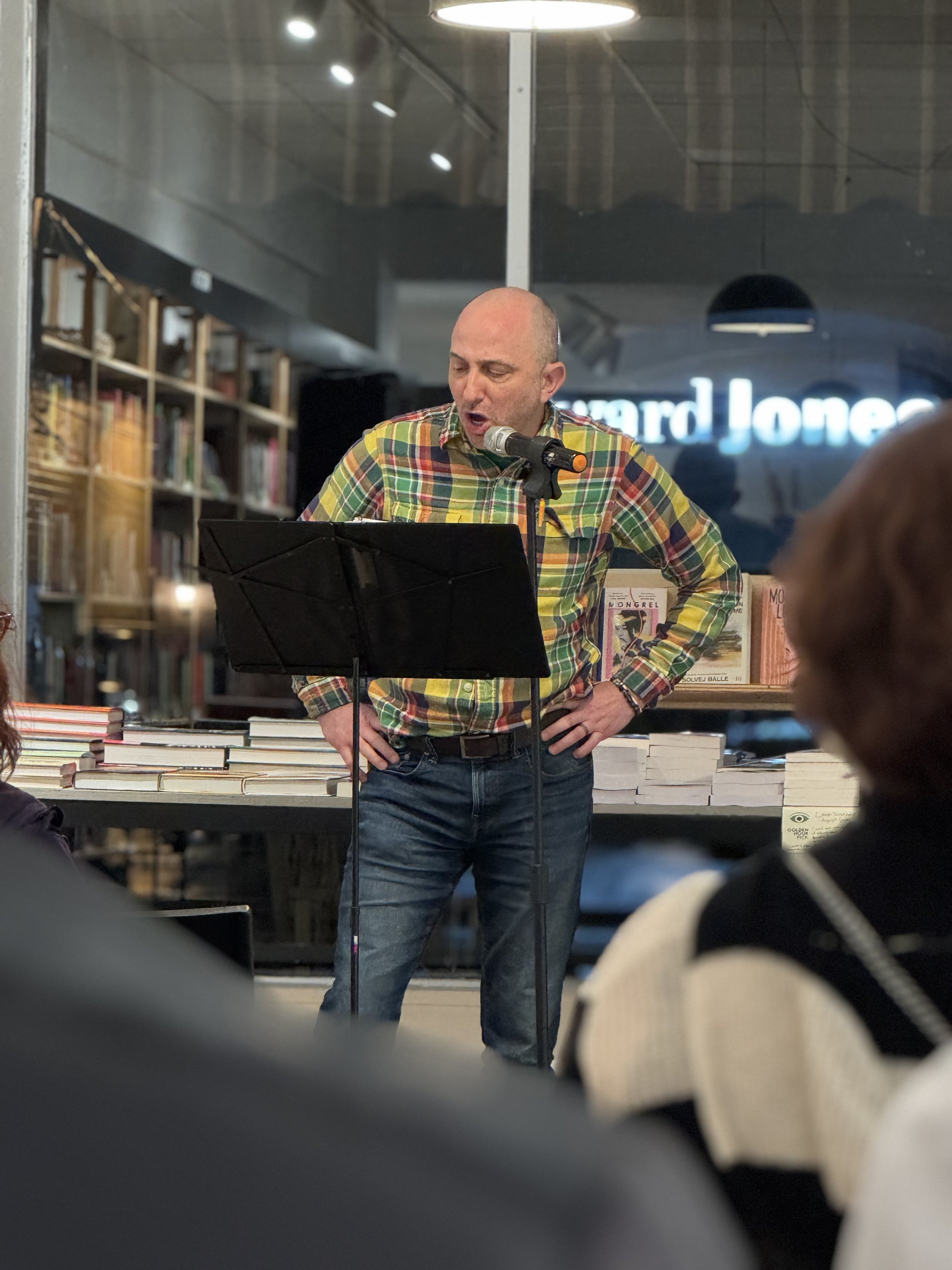 Etgar Keret was born in 1967 in Ramat Gan, Israel. The author of books, novels and short stories is one of the leading writers of contemporary Israeli literature. His works have been translated into 49 languages worldwide and have won numerous awards. More Keret bio info is below. (PHOTO: Bill Simmons read his second Keret story on Oct. 23, 2025, unofficially making him our resident Keret reader.)